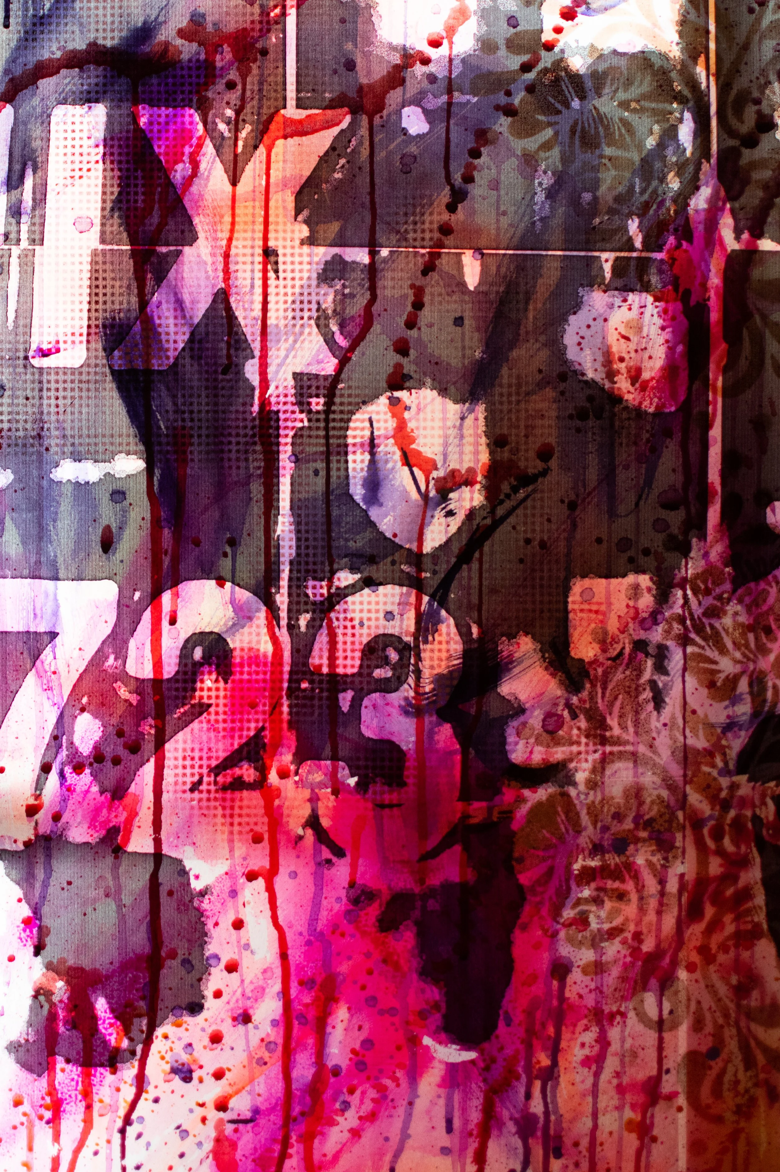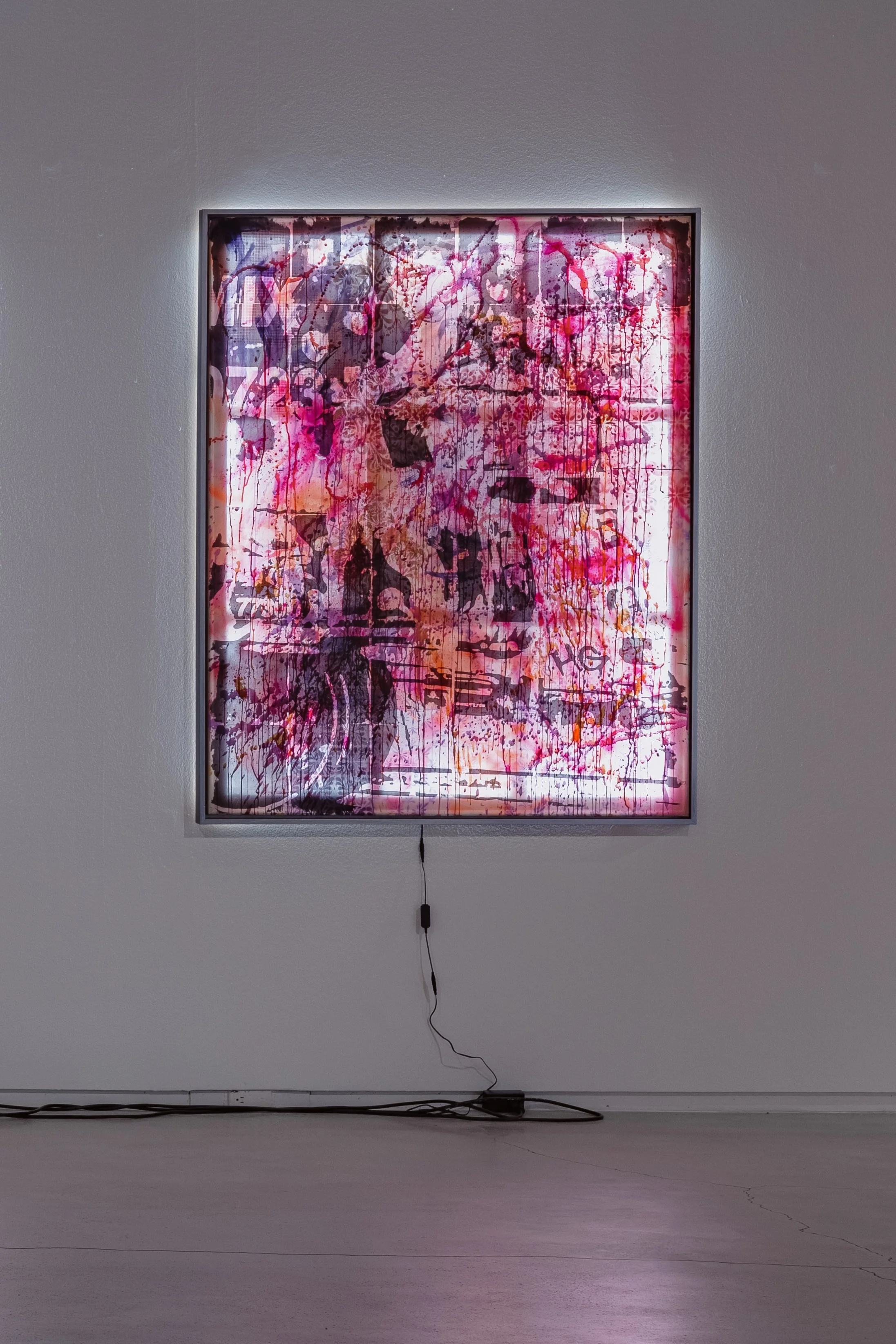 acrylic, spray paint, and toner on stretched silk inset a painted, wooden frame with LED backlighting