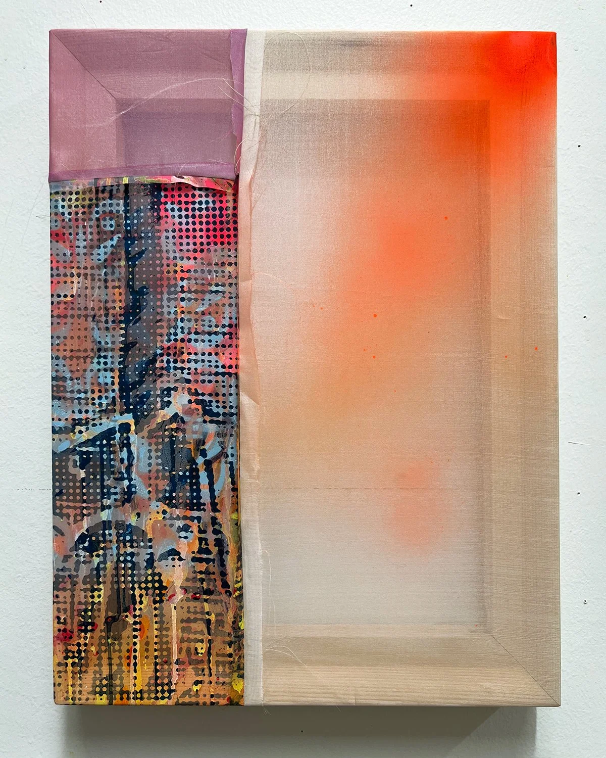 acrylic, spray paint, and serigraph on stitched, stretched silk organza