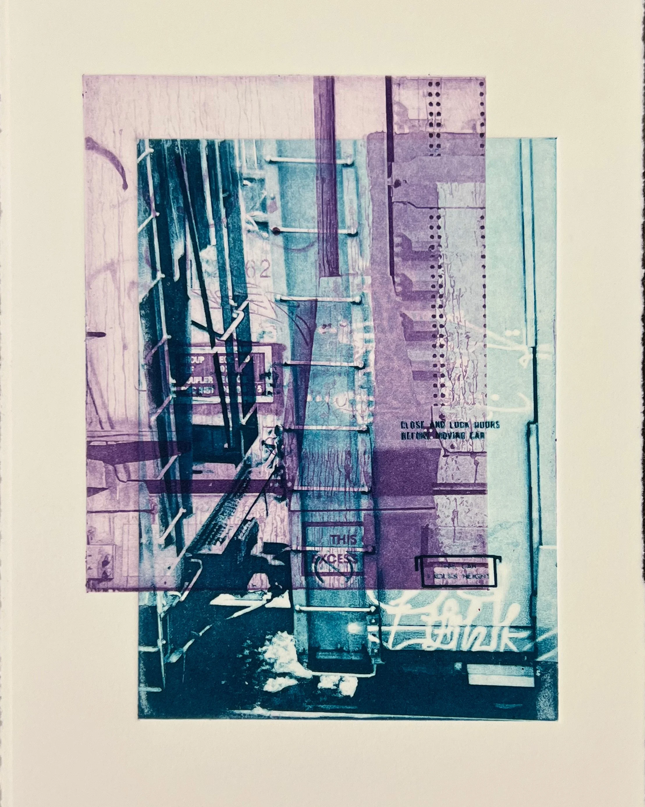 in 2024, I was awarded the Nancy Luton Education Fund and used the grant to take a two-day photogravure workshop at Flatbed Press in Austin, TX. I created several plates using my photo archive of trains and played around with playful color palettes while printing. I was interested in disrupting boundaries between gender, image, and color, using heavy machinery as my subject and in my process.