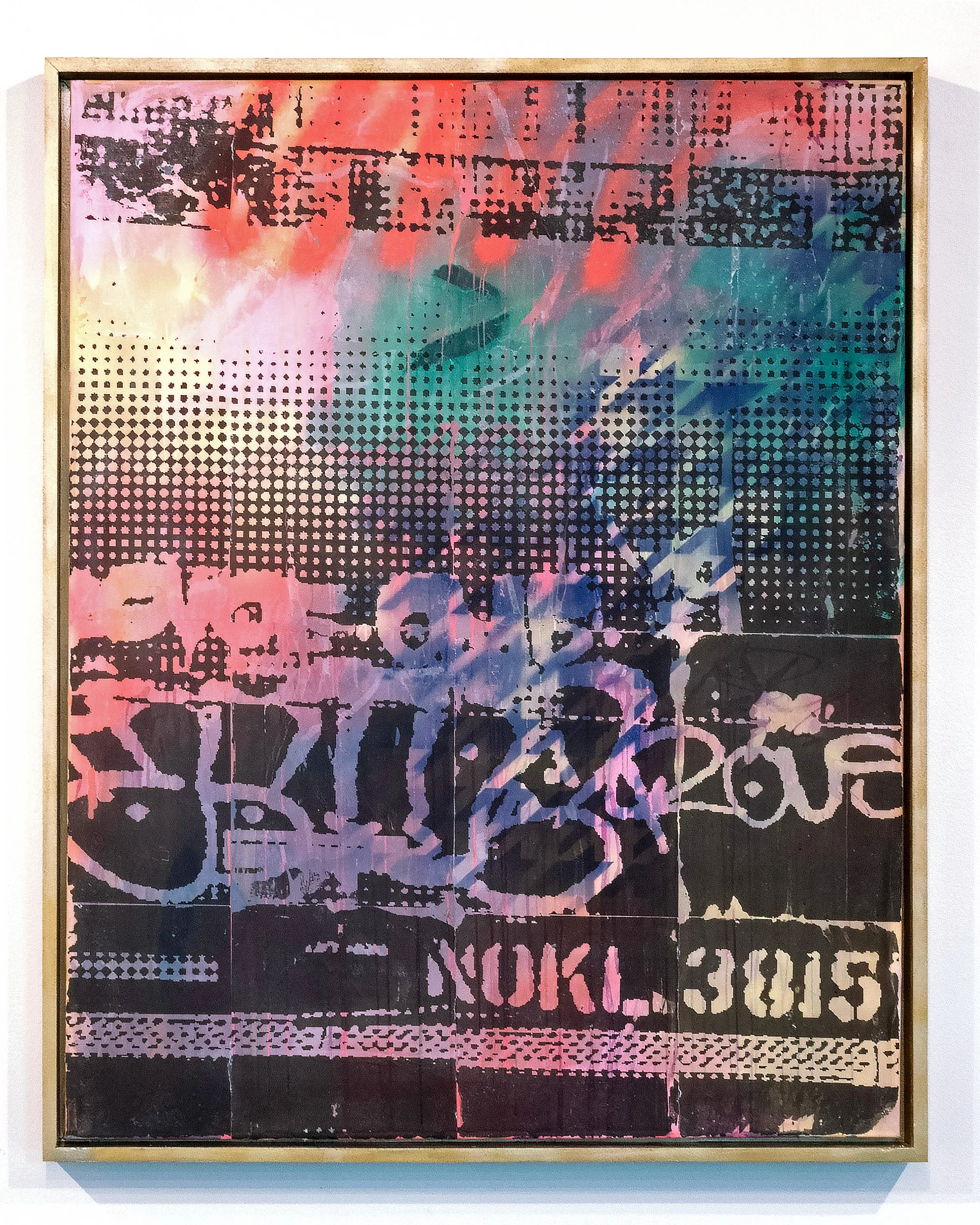 acrylic, spray paint, and toner on stretched silk organza inset a spray painted, wooden frame